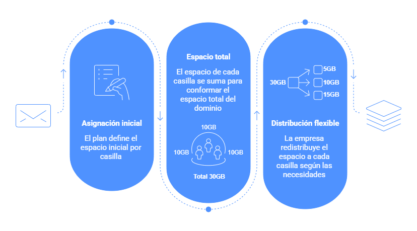 Ese almacenamiento total se comparte, pero no de forma automática ni descontrolada: la empresa decide cuánto espacio asigna a cada casilla y puede ajustar esos límites cuando lo necesite.